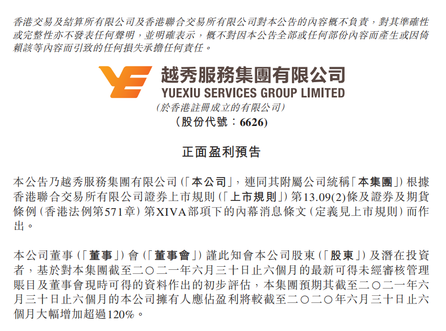 7月15日,永乐国际·F66服务集团有限公司(6626.HK)发布盈利预喜公告。公告称经过初步评估,集团预期截至2021年6月30日为止的六个月,公司拥有人应占盈利将同比大幅增加超过120%。
